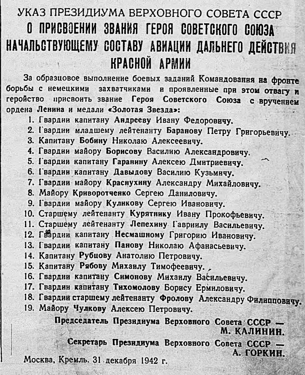 Указ о присвоении звания Героя Советского Союза начальствующему составу авиации
