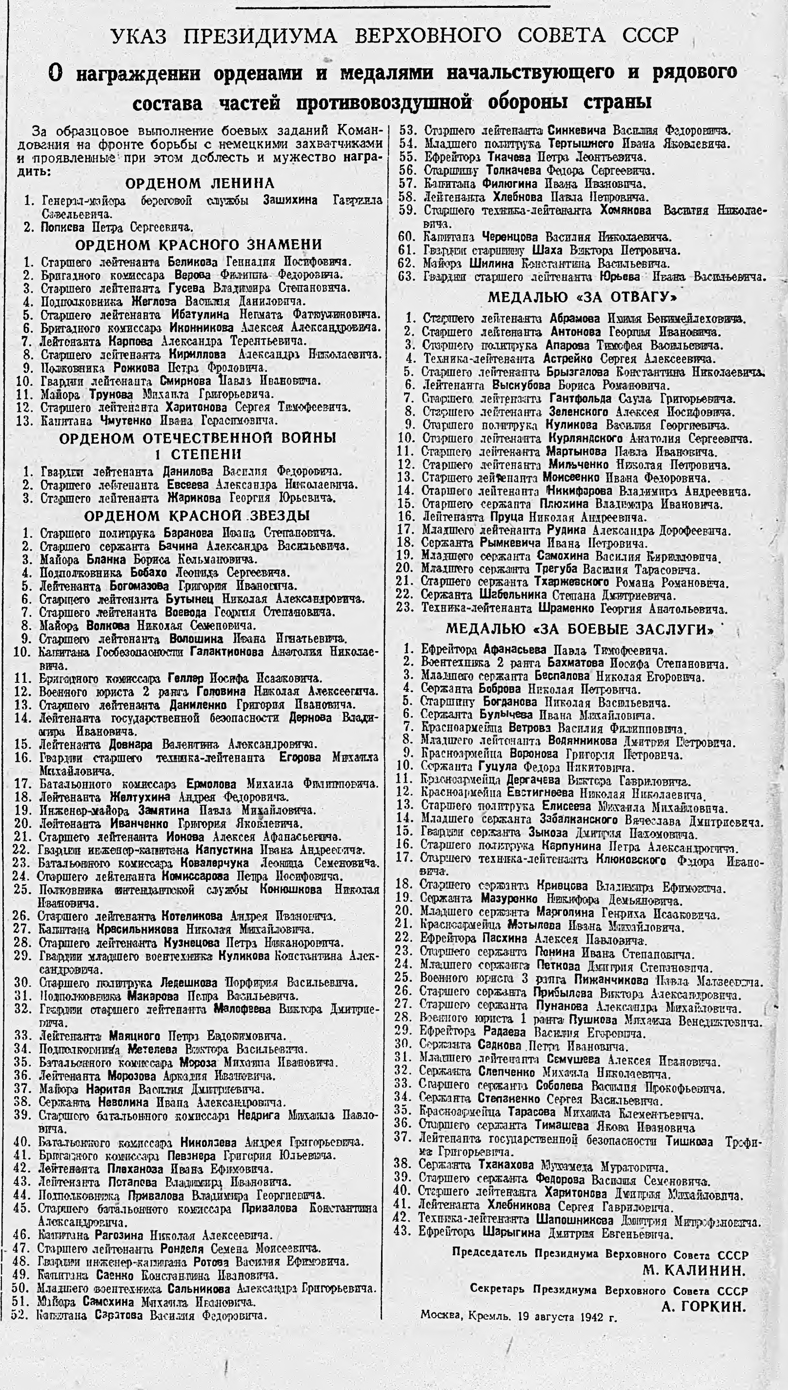 Указ Президиума Верховного Совета СССР о награждении начальствующего и рядового состава ПВО страны