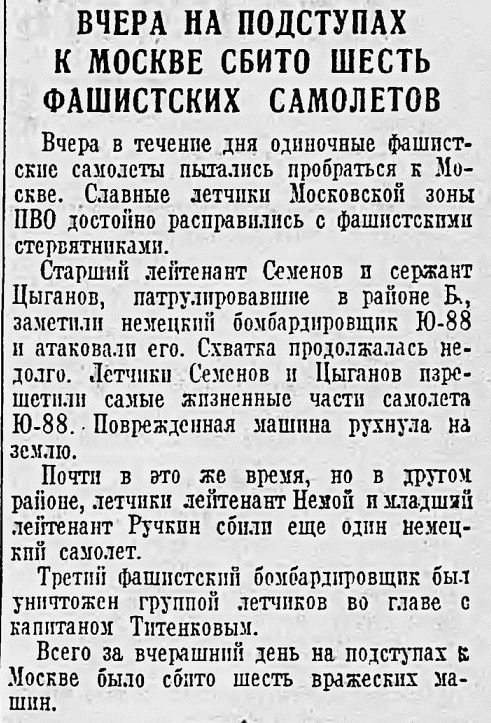 Вчера на подступах к Москве сбито шесть фашистских самолетов